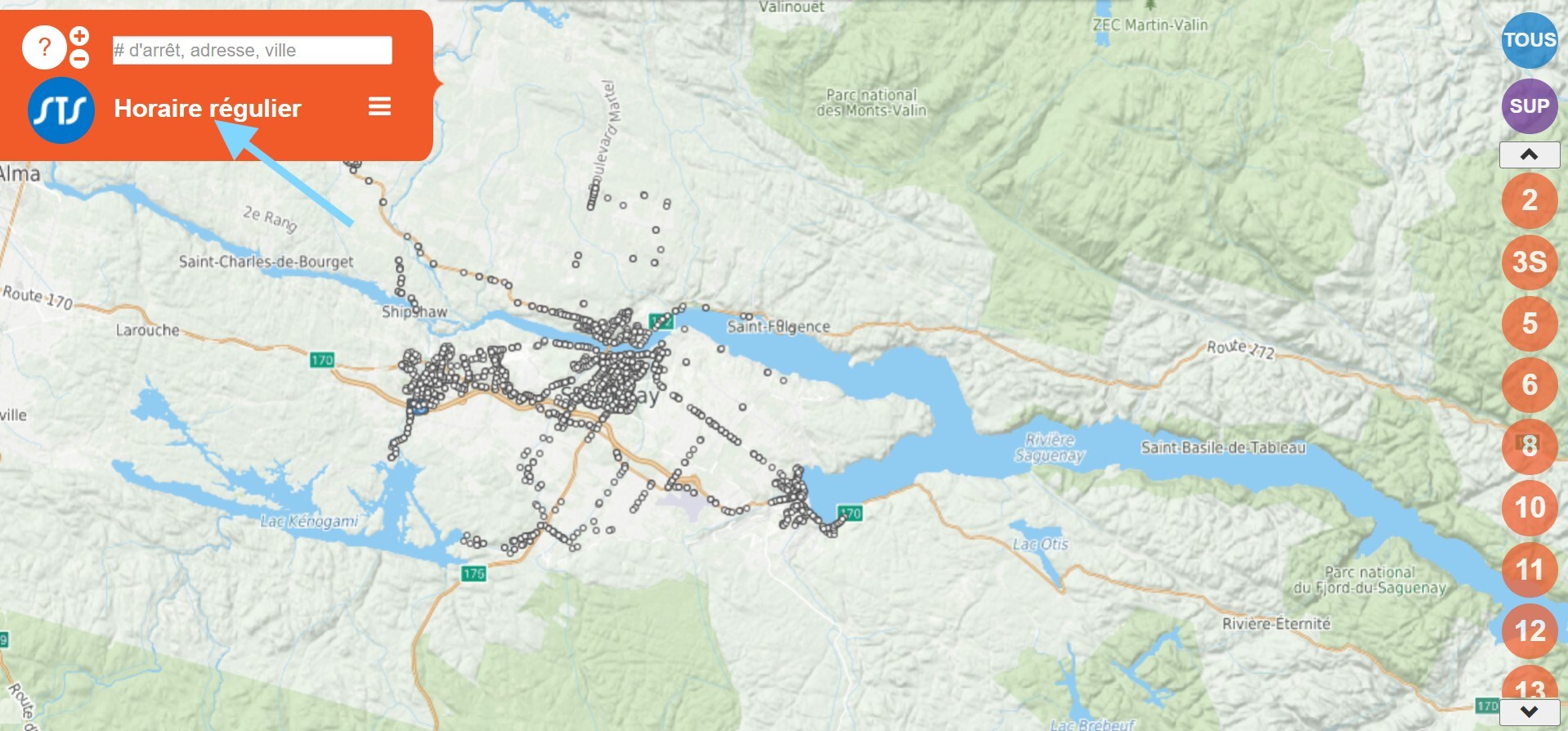 Vous pouvez utilisez notre carte interactive en sélectionnant l'horaire d'été, l'horaire régulier ou une journée de fin de semaine, dans le coin gauche.